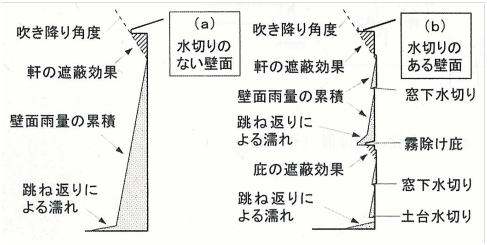 | 伝わり雨水とは、読んで名のごとく、外壁に降りかかった雨水がそのまま外壁を伝って流下したものである。壁面に何もない場合に比べ、霧除け庇や中間水切りは、伝わり雨水に対して大きな効果がある(図2)。西洋の建築に見られる軒蛇腹、胴蛇腹や、高知県の伝統的な住宅に見られる水切り瓦は、中間水切りとして機能する。中間水切りは伝わり雨水を壁面から遠ざけて地面に落とすことによって雨水の累積を防ぐ機能を持つ。また、霧除け庇は、防水上弱点となり得る開口部に作用する、直接降りかかる雨水を軽減する効果がある。 | ![]() |