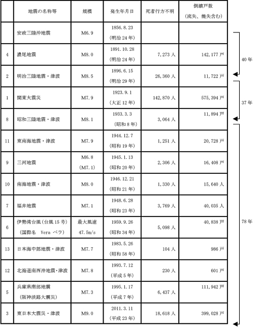 表1|死者・行方不明者が多い地震と災害(枠外の表示は東日本震災の周期。左側の数字は明治以降の犠牲者数の多い順) |