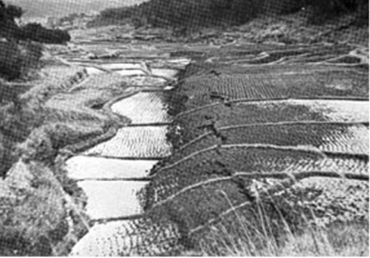 | 写真1|中島飛行機半田製作所の爆撃跡(米軍撮影) | 写真2|幸田町深溝断層。水田の右(南側)が1m以上盛り上がっている | ||