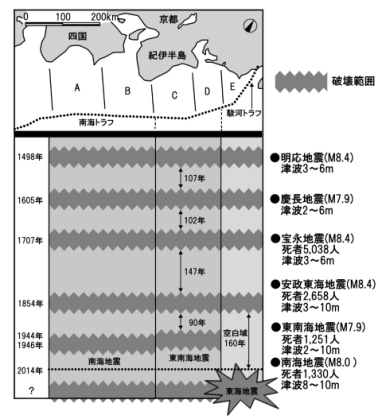 | 私たちの東海地方では、太平洋プレートが潜り込むその先のフィリピン海プレートがユーラシアプレートに潜り込んで起きる津波を伴う地震が90 〜100年間隔で起きています。長い期間でも150年です。 いつ起きても不思議ではないと言われているわれわれの住む地域の地震は、前のものは1944(昭和19)年12月7日に起きた東南海地震で、津波を伴うプレート型の地震でした。その1カ月後の1945(昭和20)年1月13日に起きた直下型の三河地震では、愛知県西三河で2,306人の死者が出ています。1946(昭和21)年12月21日には南海地震が起きましたが、東海地震は起きなかったと言われます。本当に駿河湾の東海地震はなかったのでしょうか。 東南海地震の起きた12月7日は日本軍が真珠湾攻撃を仕掛けた日と同じ日で、地震兵器が使われたとの説もあるのです。「地震の次は何をお見舞いしましょうか」−。地震の後、米軍が撒いたビラにそう書いてあり、驚いたそうです。そしてB29による爆撃が始まったと言われています(写真1)。 軍隊による報道管制が敷かれており、写真や資料が残されていないのが実情です。東海地震が幻の地震といわれているのは、そのためです。今も額田郡幸田町の深溝(ふこうず)断層(写真2)、蒲郡市の宗徳寺の地割れ、蒲郡市金平町の隆起跡など痕跡は多く残っていて、蒲郡市、幸田町、西尾市にわたり今も見ることができます。ぜひ、自分の目で見ていただきたい。 1945(昭和20)年8月15日終戦。東海地震は起きなかったと言われます。さかのぼって安政の東海、東南海、南海地震(1854年)の地震から起算をすると、160年経過しています。重要な警戒地域になっています(表2)。昨年、東海地震が30年以内に発生する確率が88%まで高まったと政府の地震調査委員会から発表されました。 |