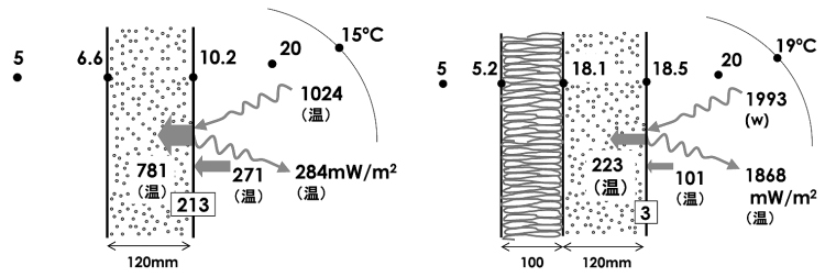 | 本題に入ろう。図1は、断熱材を施していない壁と施した壁を一例として、冬期の典型的な気象条件のもとで室内外表面の温度がどの程度になるかを計算し、それに応じた熱エクセルギーの出入りと消費を求めたものである1)。 熱の伝わり方には(長波長)放射・対流・伝導・蒸発の四態がある。図1では、波型の矢印が壁の内表面を「放射」で出入りするエクセルギー、太い矢印が「伝導」で壁表面から壁内部に入っていくエクセルギー、少し細めの矢印が「対流」で室内空気から壁表面に伝わるエクセルギーを示している。この計算例は、壁の表面が濡れていないと仮定したものなので「蒸発」はない。 熱エクセルギーには「温」エクセルギーと「冷」エクセルギーの二つがあるが、この例では冬の気象条件を想定しているので、放射・対流・伝導のすべてが「温」エクセルギーである。このことを図中ではエクセルギーの値の下に(温ex)の記号で示してある。壁内表面の下部にある□中の数値は、室内表面における放射の吸収で生じるエクセルギーの「消費」を示している。 まず注目してほしいのは、断熱材を施していない壁の内表面から室内に向かって出る「温」放射エクセルギーが284mW/㎡であるのに対して、断熱材を施している方ではその6倍を超える1,868mW/㎡が放出されていることである。また、断熱性の高い壁の内表面に入る放射エクセルギーが断熱性の低い方の約2倍になっているが、これは、外壁に断熱性を確保した方では、天井や床・内壁も外壁と同様に内表面温度が高めに保たれていると想定しているからである。 以上のように、壁や窓・床の全体に十分な断熱性が確保されると、放射エクセルギーの放出が大きくなる。それは、放射エクセルギーの消費を著しく小さくすることになる。図1の例では、断熱性が高い壁内表面における消費が断熱性の低い場合の1/70にまで小さくなっている。これは外壁と内壁とで表面温度に大きな差がないためであり、それがひいては、対流と伝導で壁内部に流入していく「温」エクセル ギーをも著しく小さくしている。放射の調整、すなわち「放調」が重要なのである。 |