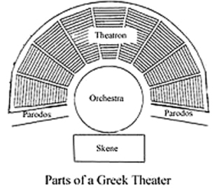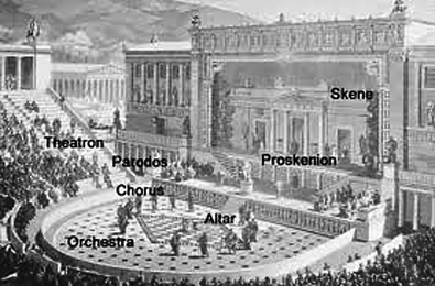 世紀、モンテヴェルディのオペラを演じるための最初の常設オペラ・ハウスができたとき、オーケストラという言葉が正式に使われたという記録に行き着く。しかしオーケストラの本当の語源はもっともっと先の古代ギリシャ時代まで辿らなければならない。 かつて、アイスキュロス、ソフォクレス、エウリピデスらのギリシャ悲劇、あるいはアリストファネスのギリシャ喜劇は、俳優たちがセリフをしゃべるだけではなく、歌も踊りも付いた現代のオペラのような音楽劇であった。これらの劇が演じられる円形劇場では、舞台と客席の間に陣取ったコロス(合唱隊)が、舞台の上の進行に応じて、歌ったり踊ったりしており、このコロスが陣取った土間がオルケストラと呼ばれていた。古代ギリシャでは合奏形態のことではなく、場所のことを指していたわけである。舞台の後ろのスケネー(楽屋)では俳優たちが自らの出番を待ち、スケネーの前のプロスケニオン(楽屋の前)で演技を行い、オルケストラでコロスが歌い踊り、それをテアトロン(客席)にいる観客たちが見ていたわけである。コロスがコーラス、スケネーがシーン、そしてテアトロンがシアターであることは言うまでもない。現在の演劇のスタイルはもちろん、言葉の源も、すべてここギリシャにあったわけだ。 |