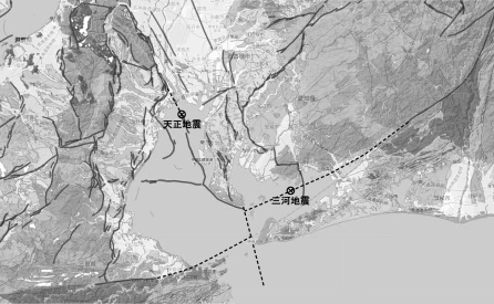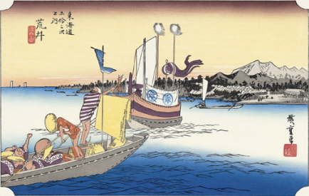 | 明応7(1498)年の明応地震は、関東から東海、東南海と連動地震が起きたことの記録が残る地震だそうです。地震と津波により多くの犠牲者(10,000人以上)がでて、伊勢の国、安濃津を壊滅させたといわれています。港町として栄えていた安濃津(現・津市)の消滅は謎となっています。遺跡がないことから諸説がありますが、地すべりや地盤沈下で海中に没したことで、遺跡が見つからないようです。現在の津は、高台に移した町なのだそうです。伊勢湾を東から西に横断する“白子―野間活断層”の西端にあたるところです(図1)。 この明応の地震と津波は、伊勢・紀伊・遠江・三河・駿河・甲斐・相模・伊豆の東海道諸国を振動させた大地震でした。余震活動も盛んであったといわれています。津波は鎌倉の鶴岡八幡宮にも襲来し、高徳院の大仏殿はこの地震による津波で倒壊して、現在の鎌倉大仏の姿になったといわれています。 この時期は戦国時代(1493年~1590年)です。静岡県浜名湖の湖南の陸はつながっていて淡水湖でした。浜名川によって海へ流れていた湖がこの地震と津波によって陸が切れ、外海(太平洋)とつながって、海水と真水が混ざった汽水湖になり、今の地形になりました。このあたりを「今切」というのは、このためです。舞阪から新居(旧名・荒井)まで江戸時代は船で渡り、東海道「今切の渡し」として浮世絵にも描かれています(写真1)。 慶長5(1600)年 今切口(浜名湖の太平洋への開口部)近くに新居関所を設置。 宝永4(1707)年 宝永地震により全壊。翌年現在地に移転。白須賀宿「東海道32番宿」は新居の隣に位置する潮見坂下にあった宿で、この地震と津波により壊滅したため高台に移され、現在の位置が白須賀宿となった。 嘉永7(1854)年 安政東海地震により大破、翌年改築される。これが現存の建物です。 明治2(1869)年 関所、廃止される。 天正13(1586)年の天正地震では、木曽川河口の島が沈没、長島城が倒壊、そのほか清洲城も被害を受け、地盤の緩さが問題となりました。五条川の堤防の破損や液状化を受け、織田氏に代わり清洲城を治めた徳川家康は、「清洲越し」を決断します。 |