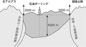 | 九州から四国、紀伊半島を通り、伊勢から伊勢湾、さらに東三河から静岡、長野・諏訪を通りフォッサマグナを横断し、関東に抜ける壮大な断層帯である中央構造線(図2)は、巨大なエネルギーがあるといわれ、龍に見立てて「龍脈」ともいわれ、「伊勢神宮」や「諏訪大社」「豊川稲荷」「高野山」など名だたる神社やパワースポットが集中しています。伊勢湾の篠島付近で中央構造線がずれているのは、もしかしたら、濃尾傾動地塊で引きずり込まれたことによるかもしれません。 フォッサマグナの断面(図3)を見ますと、深さ6,000m以上にわたり石油が出たと見られる地層がありますが、地質学的には溝になるそうです。北アルプス(古い時代の岩石)は標高3,000mありますから、それを足すと8,000 ~9,000m以上になり、ヒマラヤ山脈がすっぽり埋まってしまう、隠された溝があることになります。 かたときもじっとしていない日本列島。覚悟と備えは怠らないようにしましょう。奇跡の島に暮らしているのですから。 |