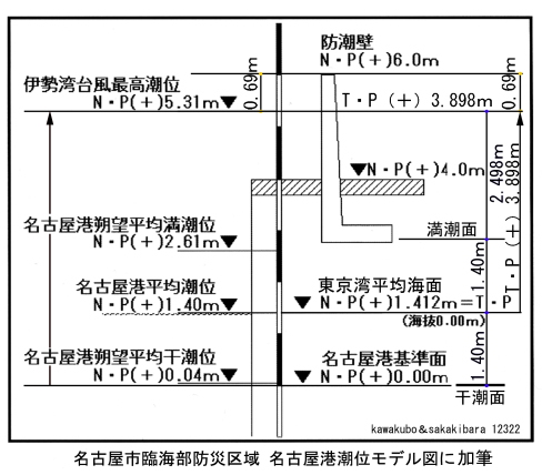 | 図1 伊勢湾台風・名古屋港潮位記録と気圧の推移 | 図2 名古屋市臨海部防災区域 名古屋港潮位モデル図に加筆 | ||