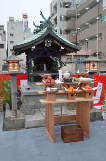 | 現在の大豊ビル。左下に橋の欄干が見える開業した大豊ビル。右の写真からは用水に沿ってカーブしている姿が分かる。道路は未舗装だが、マイカーでの買い物ができるのも魅力だった。アドバルーン広告が懐かしい | 大豊ビル屋上にある報徳二宮神社・大豊分社 (写真提供:大豊協同組合) |