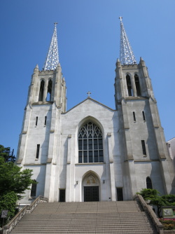 | ■紹介者コメント カトリック布池教会は、正式には名古屋カテドラル 聖ペトロ・聖パウロ大聖堂といい、2015年3月13日、国の文化審議会が下村博文文部科学大臣に答申した登録有形文化財(建造物)171件の一つである。1960(昭和35)年3月に着工、1961(昭和36)年12月に竣工し、1963(昭和37)年3月21日に献堂式、同年4月16日に、愛知県、岐阜県、石川県、福井県、富山県を管轄区域とする名古屋教区の司教座聖堂(カテドラル)に昇格した。1992(平成4)年10月5日には、名古屋市都市景観重要建築物に指定されている。現在も毎週日曜日には塔の鐘が鳴らされ、厳かにミサが取り行われている。 建築の様式は、西洋のゴチック建築を模し、内外ともコンクリート打ち放とし、その肌合いと重厚感は中世の石造伽藍を彷彿させる。建築規模は、敷地面積6,236㎡、建築面積1,011.00㎡、延べ床面積2,393.75㎡、鉄骨鉄筋コンクリート造、切妻造り銅板葺。桁行49m×張間18m、地下1階、地上4階、塔屋付。棟高21.5m、鉄筋コンクリート造角塔30.8m、鉄骨造の尖塔高さ50.2m。建築工事費107,820,000円。建設後既に50年以上経過しているが、耐震強度は、耐震診断(2003年竹中工務店実施)の結果、耐震指標Is値の0.6以上が確認されているので、耐震改修促進法上の目標値は確保されている。 建物の配置は採光を配慮して、通常の東西軸でなく南北軸とし、南正面は半地下式の集会場の上を広い階段と基壇とし、左右の双塔と切妻の本堂によりゴチック様式の立面を構成している。東西側面は柱型を突出させバットレス状とし、その結節点の水切り勾配を造形化し、軒には怪獣こそないが吐水樋を突出させ外壁の汚れを防いでいる。 教会関係者の文化財にふさわしい日常の維持管理の努力と相まって、地域のランドマークとしても高品質の施設と評価される。 |