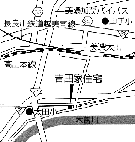 | ■紹介者コメント 中山道太田宿は江戸日本橋から数えて51番目の宿場で、開幕当時は大久保長安が奉行として治め、長安没後は尾張藩が支配した。同宿は宿駅機能だけでなく、尾張藩の太田代官所が設置されるなど木曽川筋の軍事、政治、経済の重要な拠点として位置づけられていた。 宿内のまちなみは東から上町、中町、下町に分かれ、その長さは六町十四間(約680メートル)。天保14(1843)年「中山道宿村大概帳」によれば、戸数118軒、問屋場3カ所、本陣、脇本陣各1軒、旅籠20軒であった。 吉田家は旧街道沿い、上町東端の桝形の南側に位置し、江戸時代には旅籠、大正時代から戦前にかけては煙草の元売りを営み、屋号を「小松屋」という。主屋は江戸末期の建築とされ、木造2階建て、切妻造り平入り、間口六間、奥行き七間半、正面2階は白漆喰による塗屋造りで両妻に袖壁(袖うだつ)を設けている。妻壁は土蔵造りでけらばも塗籠(鉢巻)としている。正面1階には下屋庇を設け、1、2階とも出格子を付けた典型的な町屋建築の姿を残している。 内部は中央に通りニワ、その奥に帳場、西側に居室、東側は作業場となっている。2階は6つの部屋が通りニワ上部の吹抜け周りに配置されている。明治中期以降、再三改修され、商家建築の趣が強くなっているが、かつて宿場町だった名残を示す旅籠の遺構として重要な存在である。現在は無料休憩所として開放されている。 平成17年度より旧太田宿沿道の家屋や店舗などの修景整備が行われ、まちなみ景観が向上した。現在も旧太田脇本陣林家住宅(国指定重要文化財)など地区に残る歴史的資産の保全と活用を推進し、地域住民の交流と観光及び商店街の活性化を目指したまちづくりが進められている。 |