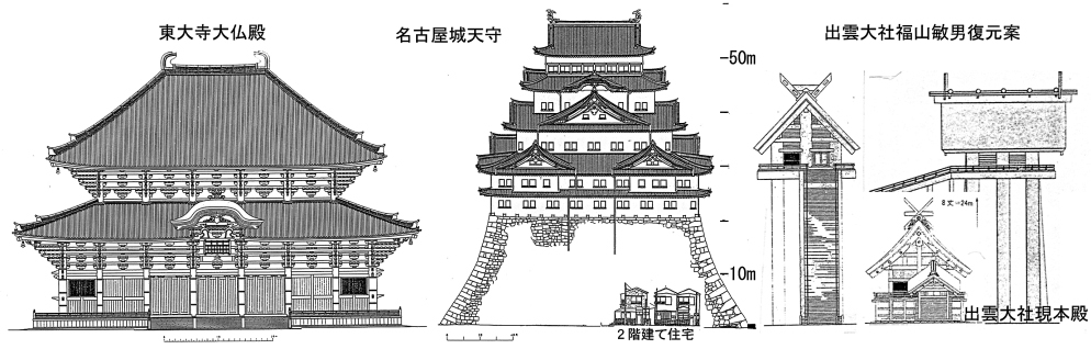 | 平安時代の数え歌である『口遊』には、当時の大建築を取り上げて「雲太、和二、京三」と記され、出雲大社、東大寺、平安京大極殿(当時の国会議事堂)が該当するのだといいます。記載順は大きさなのか、神社、寺院、政庁、三つの建築種を示したものか。いずれにせよ出雲大社が天下の大建築であったことは事実なのでしょう。2000年、出雲大社境内遺跡で13世紀半ばの本殿の一部と考えられる巨大な三本柱が出現しました。建築史の分野では衝撃的な発見です。現在の本殿は千木までの高さが8丈(24m)、8階建てのマンションほどで十分に高い。しかしかつての本殿の高さは16丈(48m)あったと伝承に記されています。発見された巨大な棟持柱は、出雲大社宮司の千家家に伝わる『金輪御造営差図』に描かれる本殿そのまま。疑問視されてきた16丈の本殿が、にわかにリアリティーを持ち始めてきたわけです。 出雲大社本殿を量ることは、すなわち高さを知ること。福山敏男の復元案をもとに、2つの建物と比較してみましょう(※ 図1)。ひとつは木造建築として最大級の規模を誇る東大寺の大仏殿(金堂)、もうひとつは木造での復元が世間を賑わせている名古屋城大天守です。本来ならば併存しない三つの建物も、相並べ量ることにより発見があります。どれも間近で仰ぎ見ることが可能なのですが、出雲大社の高さの本質は、柱状の高さそのものにあり、東大寺大仏殿は、その量感にある。名古屋城は、高い石垣と階を重ねた結果としての高さにある。 そして高さを知ることで別の気づきが生まれます。仰ぎ見ることで崇高(sublime)な感情を想起させることが目的とするならば、高さや大きさは重要なファクターとなります。しかし建築としてみたときに違いもあると。天上とこの世をつなぐ依り代としての高さを示した出雲大社、軍事的な側面から見渡す場としての高さを求めて高楼となった名古屋城天守、いずれも人が中に入り感じるための空間を内包しない。ギーディオンが示した空間概念の段階的展開からみれば、pre-spatial(前・空間的)な建築であるといえるでしょう。主体を人間に置くならば、見つめる対象物としての高さ、摩天楼と同じともいえます。いや天守にも各階に室空間はあると反論する人もいるでしょう。しかしそれはあくまでも高みに登るためにできあがった階層であって、ましてや膨大な床面積を占める室群には、仏堂のような空間としての意味はない。むしろ意味を持つ内部空間を内包しないことに、建築的な存在意義があるのだといえるわけです。 一方、東大寺大仏殿はこれら2例とは異なります。井上充夫著『日本建築の空間』によれば、古代、仏堂は仏像が安置されるためだけの内部空間を持ち、やがて中世では人のための礼拝の場(礼堂・外陣)が発生して、空間的な変容に至るのだと理解される。しかし主体をどこに置くかはさておき、東大寺大仏殿でも、人が中に入り感じる空間を内包し、荘厳が施されるその空間の確保に建築的な存在意義があった。そこには新たな「はかる」ことの必要性が浮かび上がってきます。 |