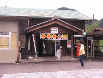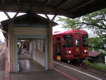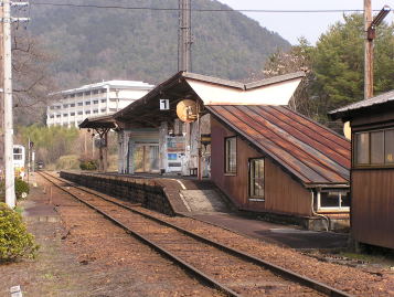 | 本屋正面の車寄せ | プラットホーム 延長98m 側面玉石積み | 待合所とホーム上屋 停車中の観光列車「ながら」 |